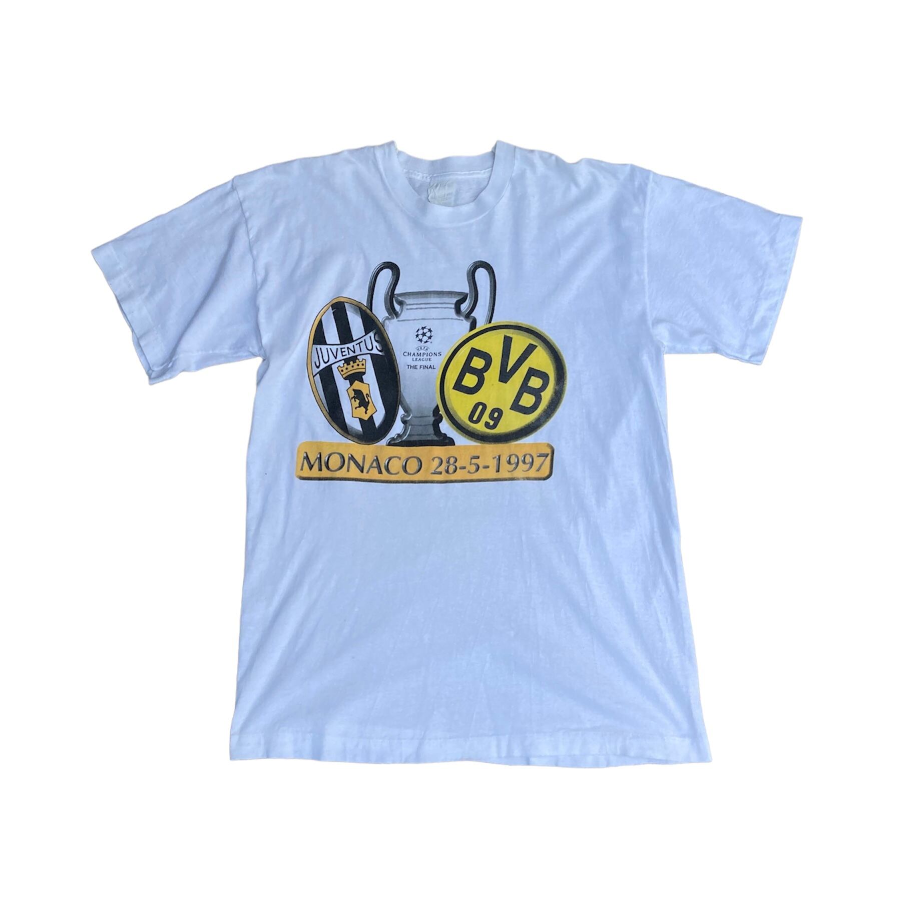 1997年チャンピオンズリーグ決勝の記念Tシャツです。見ての通りユベントスとドルトムントです。タグが薄れてますがscreen starsで裾袖シングルです。プリントもなぜか少し右寄りにずれてます。面白いです。これと一緒に出してるジャージ合わせて買って下さい。